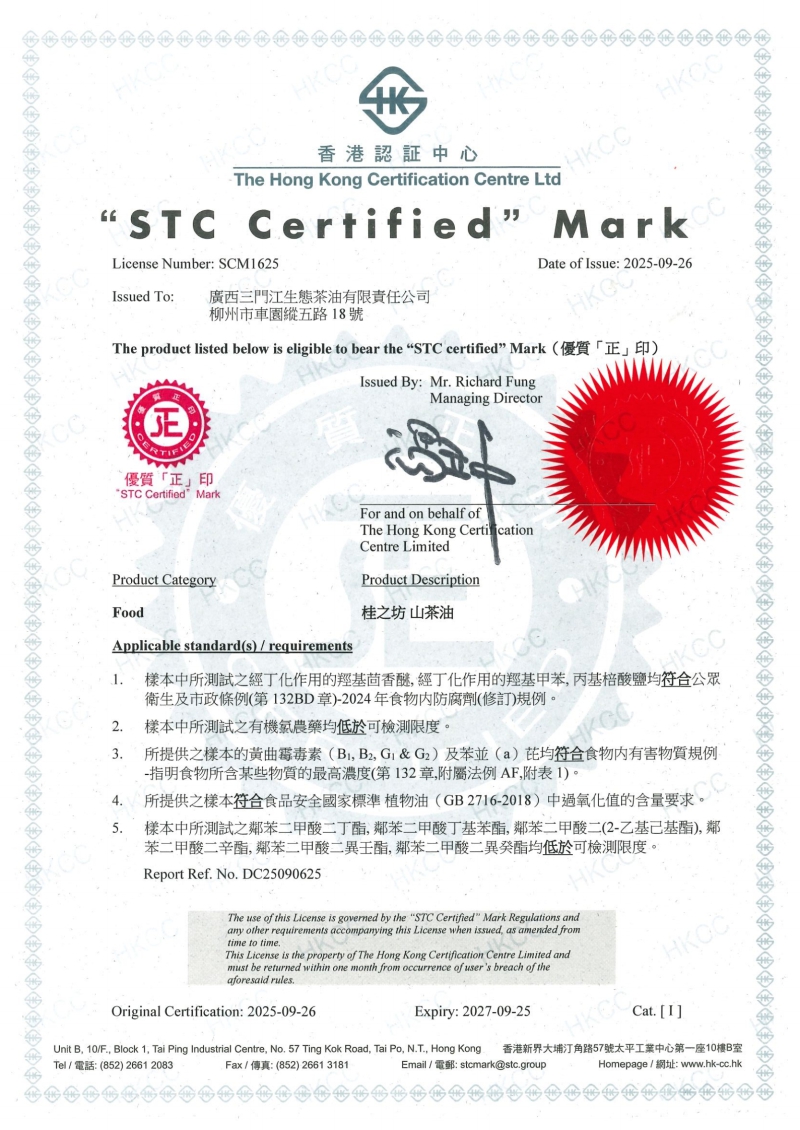 近日,桂之坊山茶油通过香港标准及检定中心(STC)检测,再次荣获“优质「正」印”认证!自2020年8月27日首次获证以来,桂之坊山茶油已连续四次通过这项国际公认的权威品质考核,产品质量得到了持续性的国